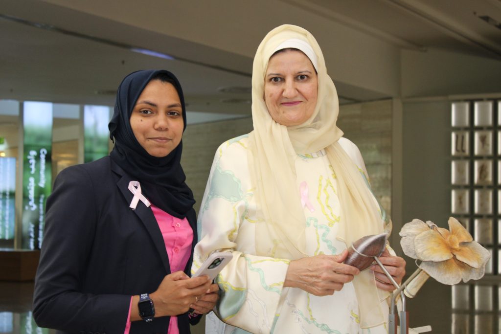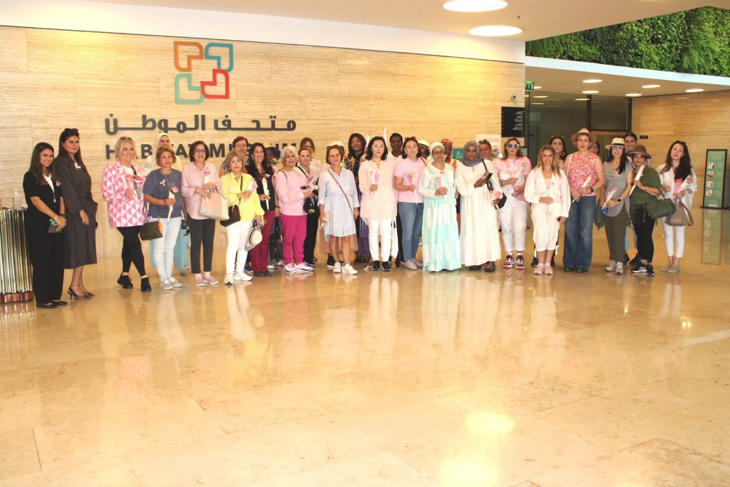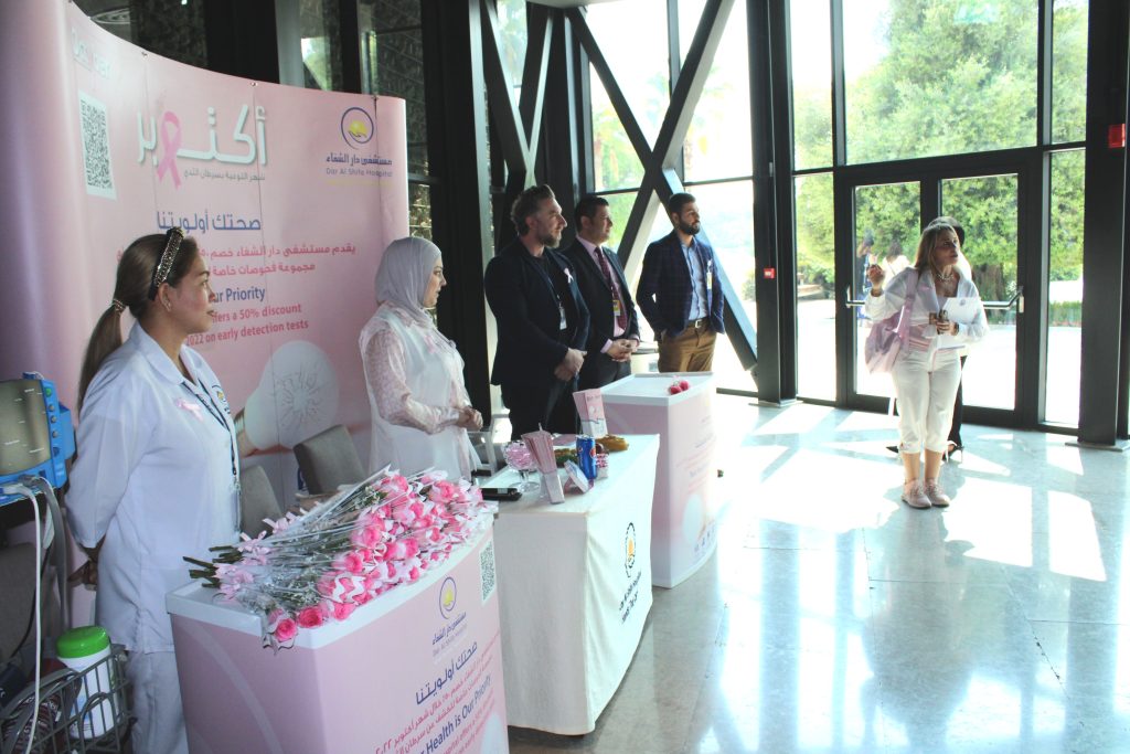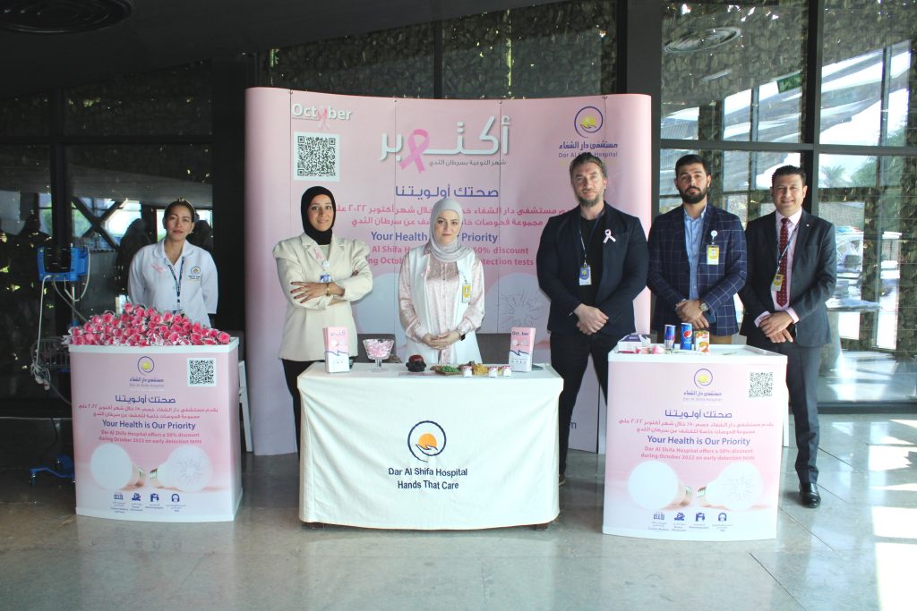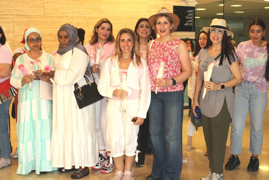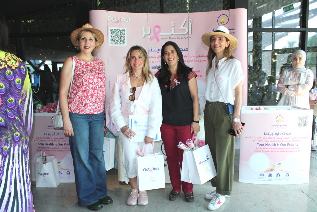 The hospital staff distributed Pink Ribbons and examined women’s blood pressure and sugar. Dr. Israa abdel Rida, senior dietitian, explained the important food safety directives that would fight breast cancer, and a symbolic gift was presented to the members and a discount coupon on special tests to detect breast cancer.